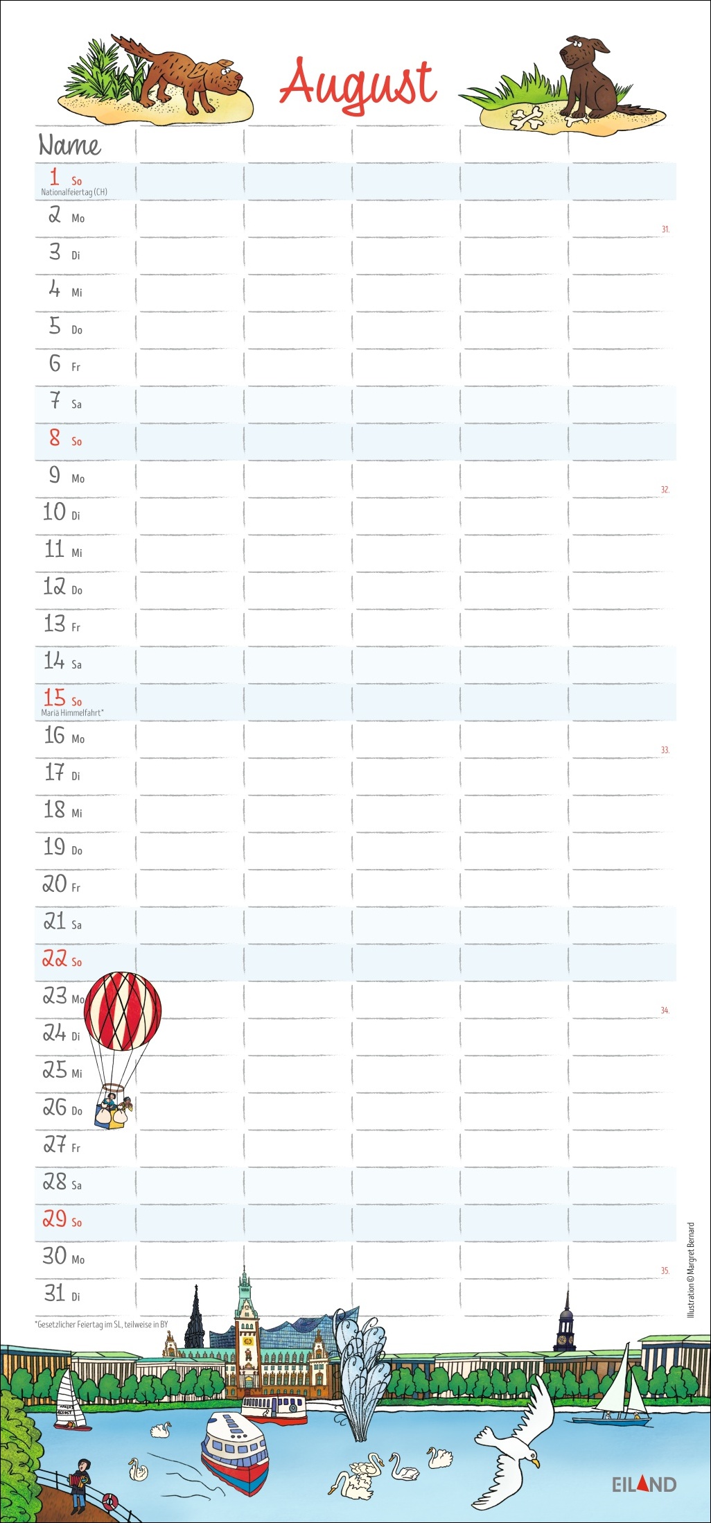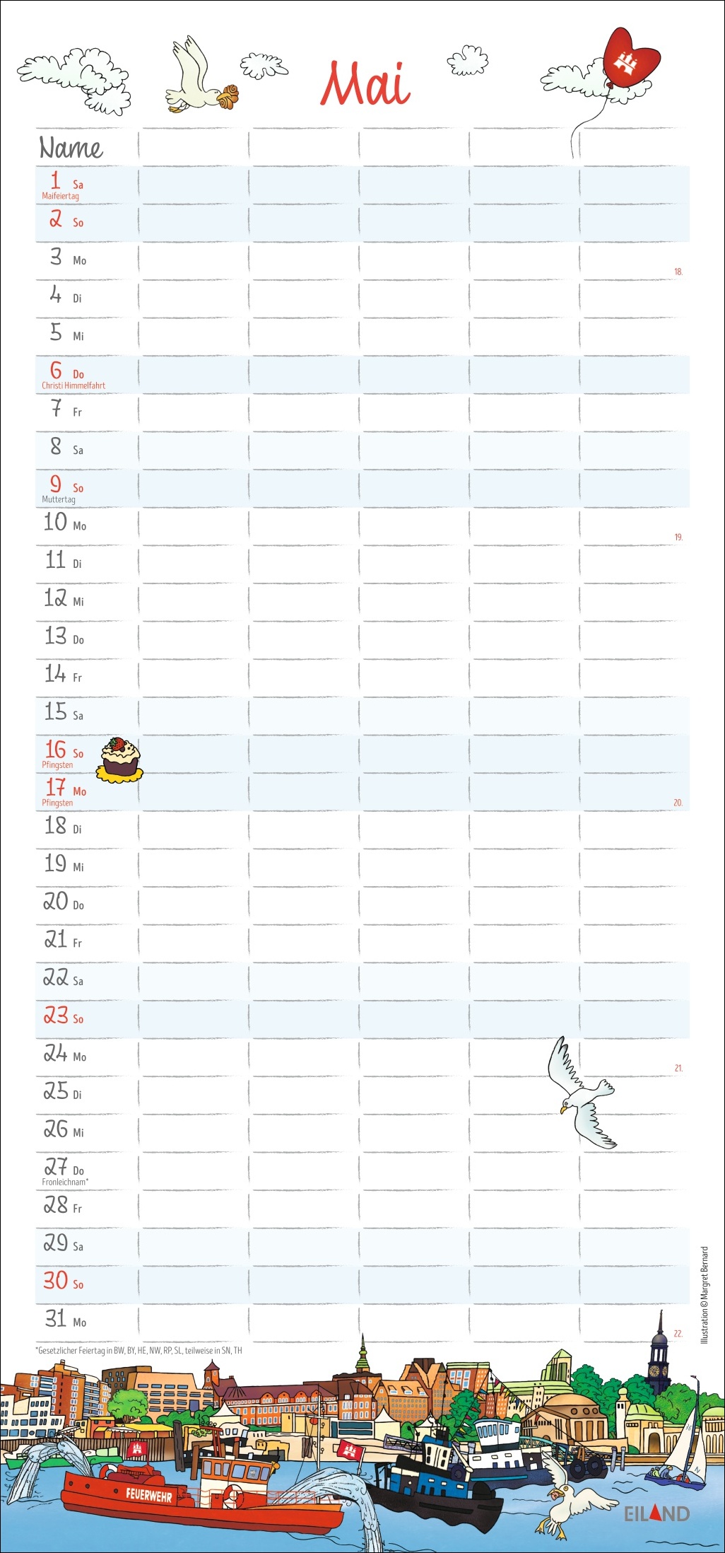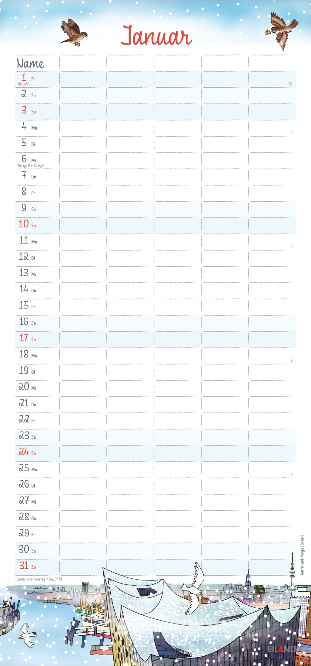 - Platz für Termine, Ferien- und Freizeitaktivitäten und dazwischen farbenfrohe Zeichnungen über das Leben zwischen Alster, Elbe und Hafen